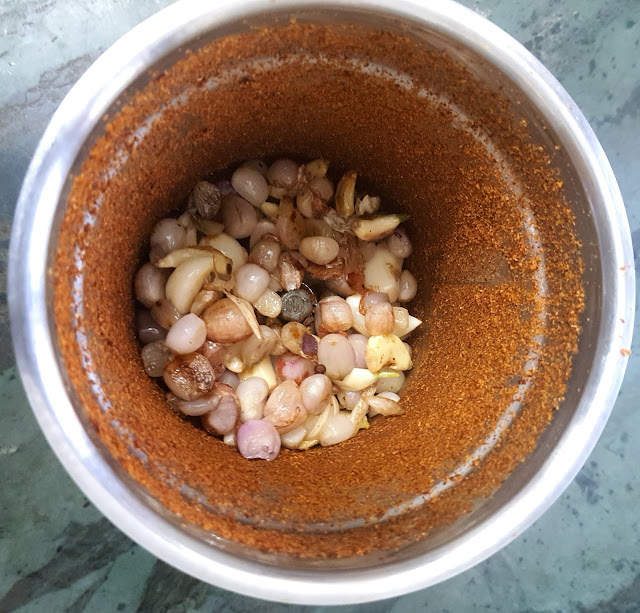 10.  Then into that powder add sauteed small onion and garlic and using pulse mode pulse it coarsely.